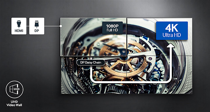 - Dễ dàng cấu hình các màn hình hiển thị thành chuỗi các màn ghép 5x5 với cùng bộ chuyển đổi mà không cần tốn chi phí cho các card đồ hoạ đắt tiền hoặc bộ chia UHD. Các giải pháp màn hình hiển thị Samsung sử dụng cổng Display Port (DP) 1.2 kết hợp với cổng HDMI để hỗ trợ hiển thị các đoạn phim chất lượng cao và nâng cấp chất lượng nội dung với độ phân giải lên đến 4K.