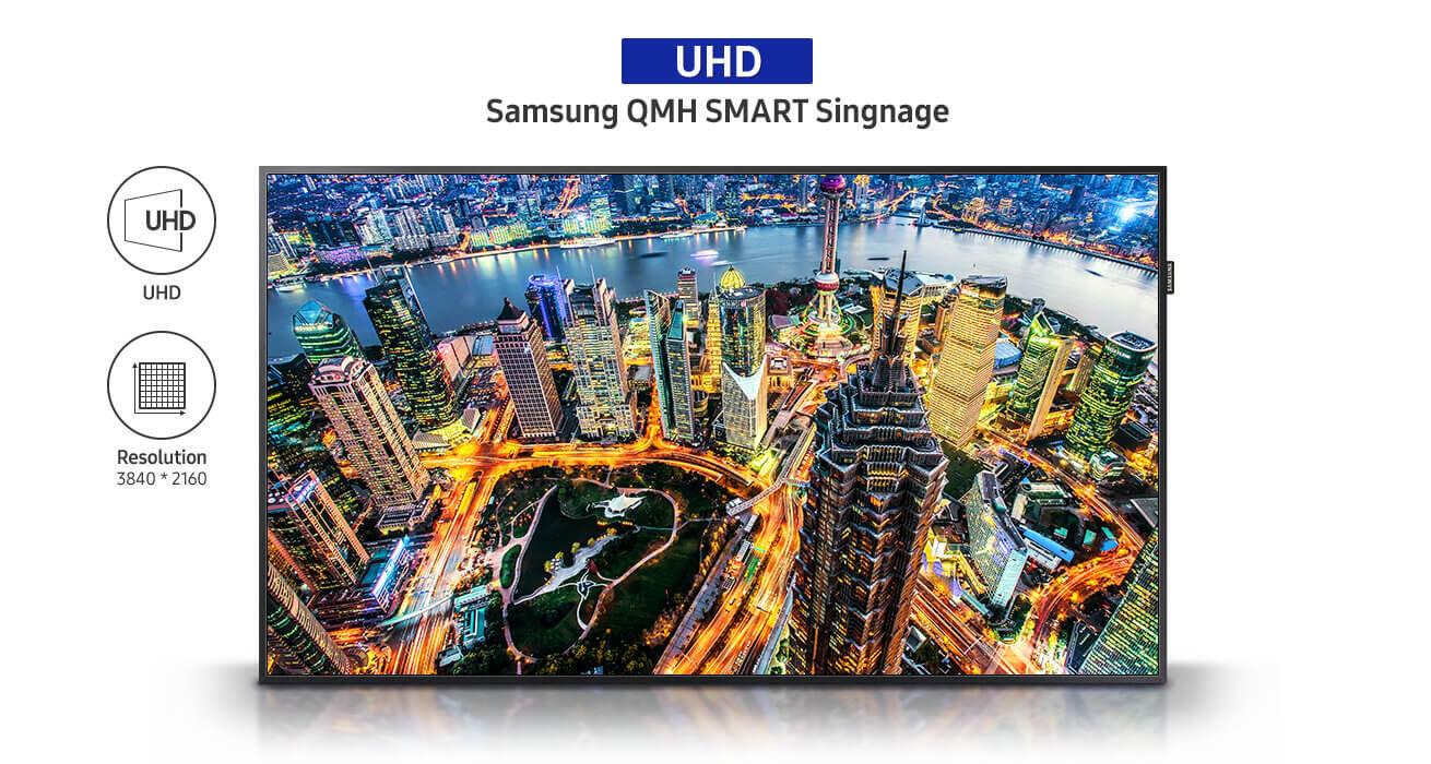 - Màn hình dòng QMH của Samsung hiển thị nội dung với hình ảnh ấn tượng, đồng thời cải thiện hiệu quả vận hành. Với chất lượng hình ảnh UHD, màn hình làm sống động không gian với nội dung cuốn hút và dễ ghi nhớ. Ngoài ra, màn hình cũng trải qua quá trình kiểm nghiệm nghiêm ngặt và chứng nhận đảm bảo vận hành xuyên suốt. Với SSSP 5.0 và hệ điều hành TIZEN 3.0 mạnh mẽ, màn hình hỗ trợ đầy đủ các chức năng tiện dụng cho doanh nghiệp, bảo vệ dữ liệu kinh doanh thông qua lớp bảo mật tăng cường.