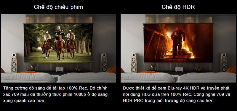 Chế độ HDR: Được thiết kế để xem Blu-ray 4K HDR và truyền phát nội dung HLG dựa trên 100% Rec cùng công nghệ 709 và HDR-PRO trong môi trường độ sáng cao hơn.